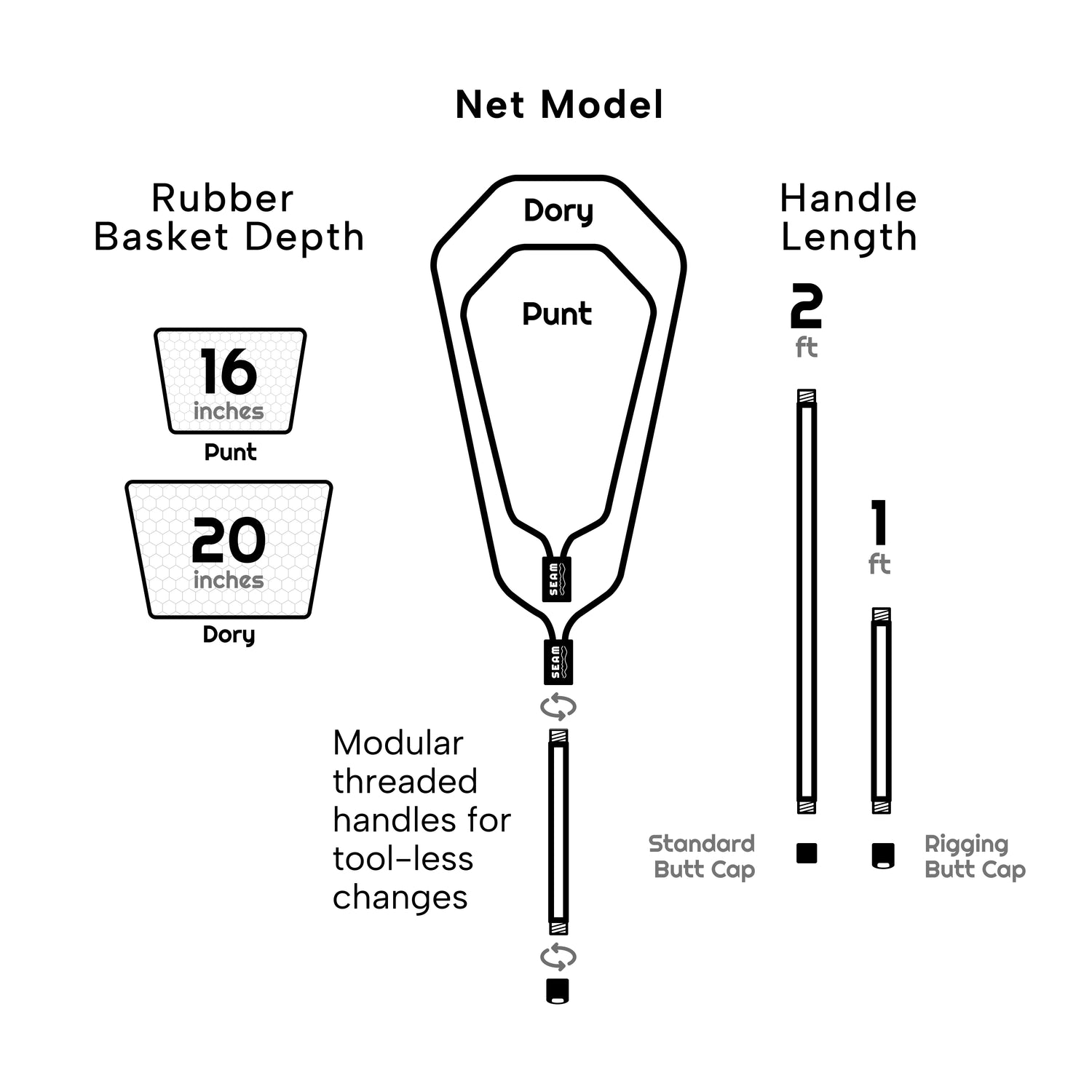 One day you’re high-sticking a brushy creek and the next you’re on the deck of a drift boat. The Full Reach Bundle lets you take full advantage of our modular threaded system. The bundle includes both the Punt and Dory baskets, both handle lengths, and both butt caps.